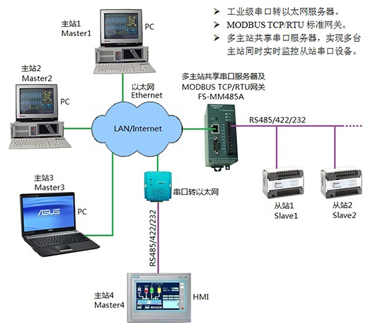 串口服務(wù)器及MODBUS TCP/RTU網(wǎng)關(guān),支持多主站。