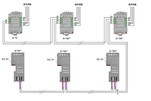 解決以上問(wèn)題的最簡(jiǎn)單有效的辦法是在PLC和變頻器的RS485通訊口加裝帶浪涌保護(hù)的RS485光電隔離器以消除地線環(huán)路的干擾和變頻器特有的瞬態(tài)過(guò)電壓等干擾,下圖是采用德陽(yáng)四星電子技術(shù)開(kāi)發(fā)中心生產(chǎn)的PFB-G總線隔離器和BH-485G隔離器組成的PLC和變頻器通訊網(wǎng)絡(luò),由圖可見(jiàn),所有設(shè)備的RS485口均被隔離,整個(gè)通訊線路被浮空,有效的抑制了干擾的進(jìn)入,也徹底解決了由于設(shè)備接地問(wèn)題而引起的串?dāng)_,使系統(tǒng)的可靠性得到很大提高。