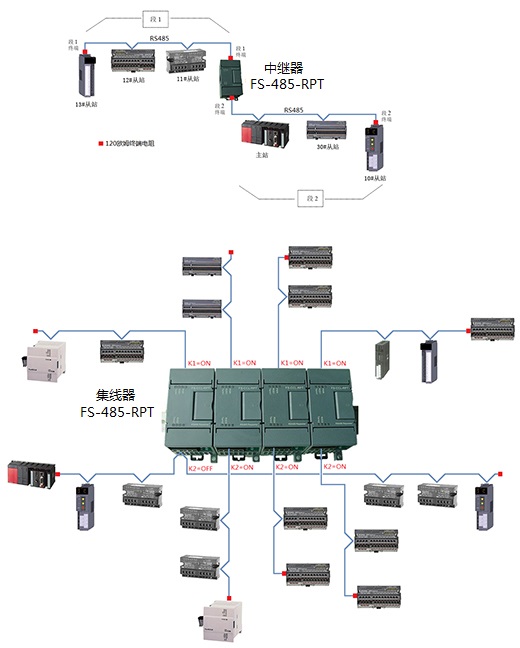 可擴(kuò)展數(shù)量 | 單個使用作為中繼器,N個可組合成2N口集線器。最多可以擴(kuò)展10臺FS-485-RPT組合成20口集線器。 |
