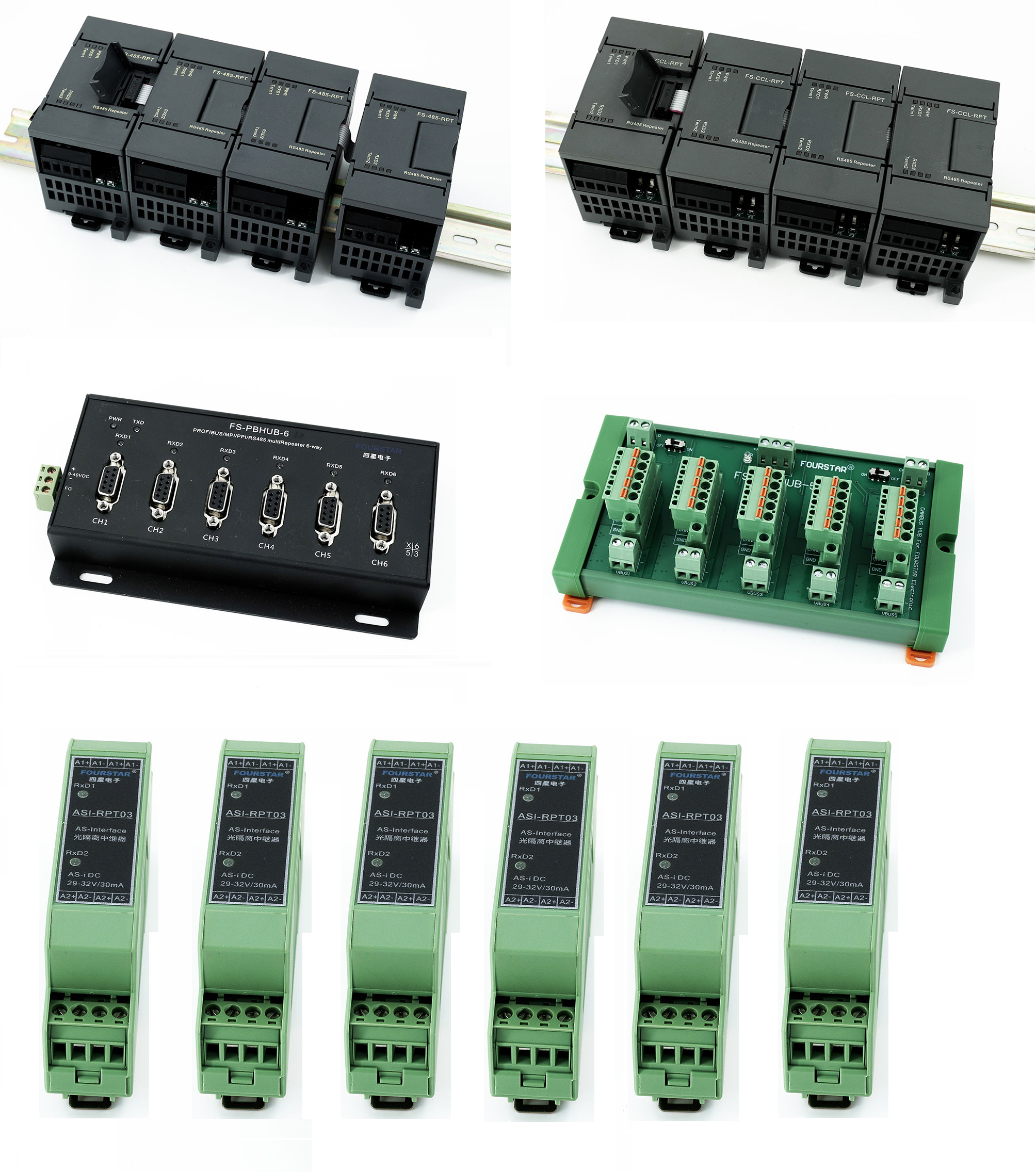 四星電子為RS485和CAN總線的星型連接拓?fù)溲邪l(fā)出了系列集線器,如組合式RS485集線器、組合式CC-Link集線器、組合式LonWorks集線器、PROFIBUS集線器、CAN總線集線器、AS-i總線集線器等系列產(chǎn)品。如圖7-2所示。
