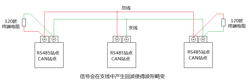 當(dāng)RS485或CAN信號在總線上傳輸時,會在支線中產(chǎn)生回波使得信號波形畸變,當(dāng)支線長度過長或者支線站點過多時尤其嚴(yán)重。常見的錯誤支線如圖3-2所示。