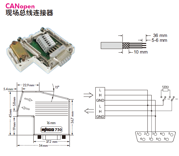 對于接口形式是DB9插座的現(xiàn)場總線,如PROFIBUS、PPI、MPI、CANOpen,西門子等公司早已設(shè)計有PROFIBUS總線連接器(俗稱DP插頭)、CANOpen總線連接器等部件,只要使用這些連接器就可實現(xiàn)無支線的網(wǎng)絡(luò)結(jié)構(gòu),PROFIBUS總線連接器的原理圖見前面的圖2-7,下面圖3-3是CANOpen總線連接器原理圖。