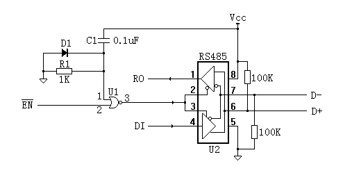 當(dāng)上電瞬間,C1電壓不能突變,或非門U1的1腳為高電平,輸出3腳為低電平,確保了RS485芯片U2的發(fā)送器關(guān)閉,不會對總線造成擾動;當(dāng)經(jīng)過t=R1×C1時間后,U1的1腳變?yōu)榈碗娖剑鼓苄盘朎N才開始控制RS485芯片U2的數(shù)據(jù)收發(fā)。二極管D1的作用是反向電壓鉗位保護(hù)。