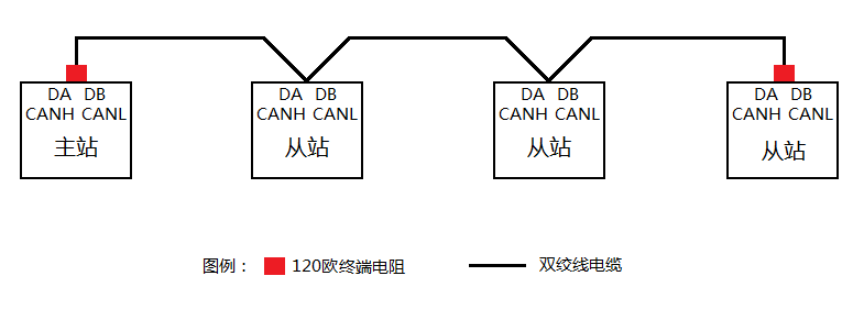 眾所周知,RS485和CAN是一種采用雙絞線(特性阻抗為120歐姆)傳輸?shù)摹?strong>手牽手、無支線、總線兩端必須有終端電阻的一種線性總線結(jié)構(gòu),如圖1-1所示。