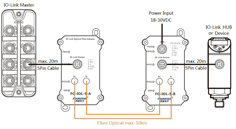 IO-Link轉(zhuǎn)光纖適配器FO-IOL-S,使用光纖可將IO-Link的傳輸距離延長(zhǎng)到10公里。