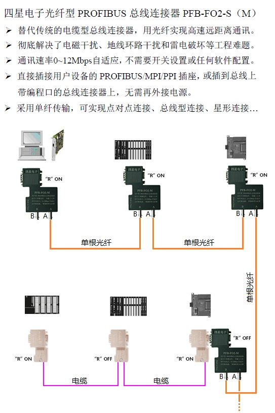 迷你型PROFIBUS光纖適配器,1電2光,單模單纖,90度安裝。