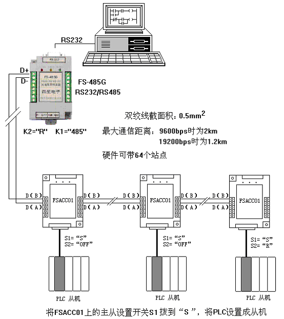 通過(guò)在每臺(tái)PLC的通信口(TER口)安裝FSACC01隔離器,如下圖所示的主從式RS485網(wǎng)絡(luò),無(wú)中繼器時(shí)可實(shí)現(xiàn)最大通信距離為2公里(9600bps時(shí)),19200bps波特率時(shí)通信距離可達(dá)1.2公里,如需傳送更遠(yuǎn)距離可在總線(xiàn)中加裝RS485中繼器(型號(hào):E485GA),F(xiàn)SACC01的通信速率為0~250Kbps自動(dòng)適應(yīng)。