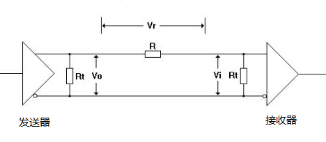 圖中:Rt為終端電阻,Rt=120歐;R為雙絞線電纜電阻(二根線的電阻),阻值由線路的長度和粗細(xì)確定;Vo為CAN發(fā)送器輸出電壓,當(dāng)接上終端電阻Rt時,Vo=2V;Vi為CAN接收器的輸入電壓,Vi≥0.9V時信號有效。