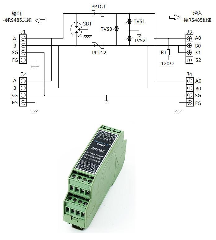 該保護(hù)器內(nèi)還帶有120歐終端電阻,通過短路S1、S2端子來接入終端電阻,而且該產(chǎn)品設(shè)計成J1、J2雙接線端子,這樣便于實現(xiàn)手牽手的無支線的連接方式。
