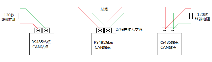 對于那些只有一對接線端子的RS485和CAN接口,可采用雙線并接一個端子的方式來實現(xiàn)無支線結(jié)構(gòu),如圖3-5所示。